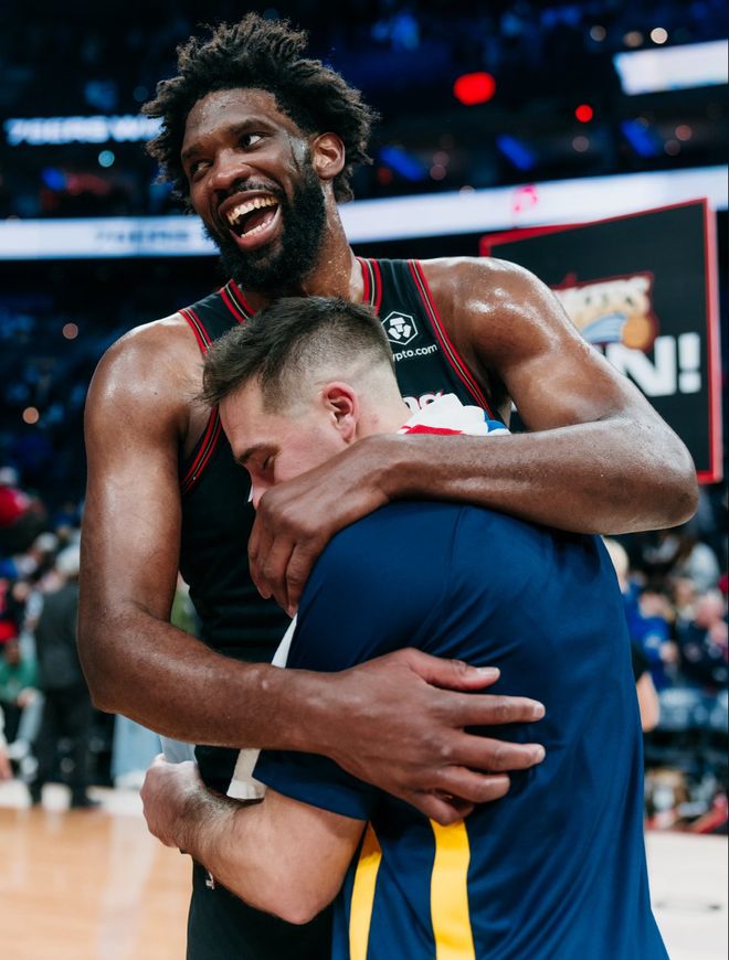 賽后恩比德與老隊友麥克康奈爾緊緊相擁,這兩人依舊保持了不錯的友誼。