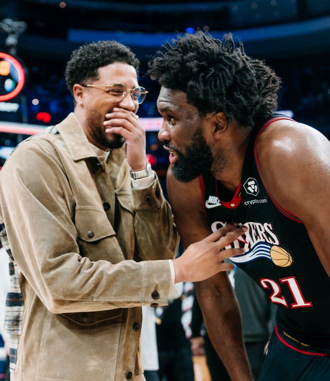 除此之外恩比德還跟因為跟腱大傷賽季報銷的哈利伯頓相談甚歡,很多球迷覺得這一幕略顯曖昧,難道這兩人在密謀些什么?